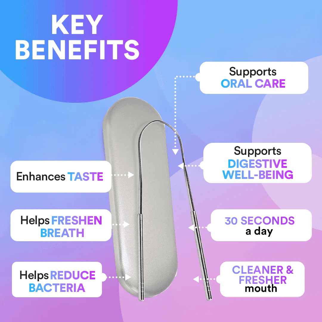 Whether you're looking to reduce the white-coated appearance on your tongue or support your daily oral care routine, this effective Tongue Scraper has got you covered. Immediate benefits of tongue scraping with this tool include a fresher breath and boosted confidence — all part of feeling your best, every day.